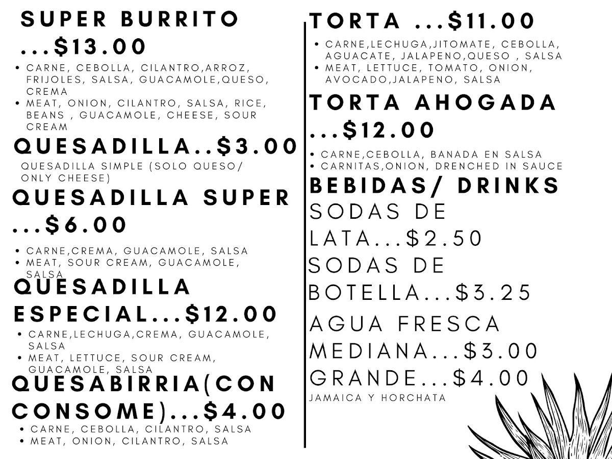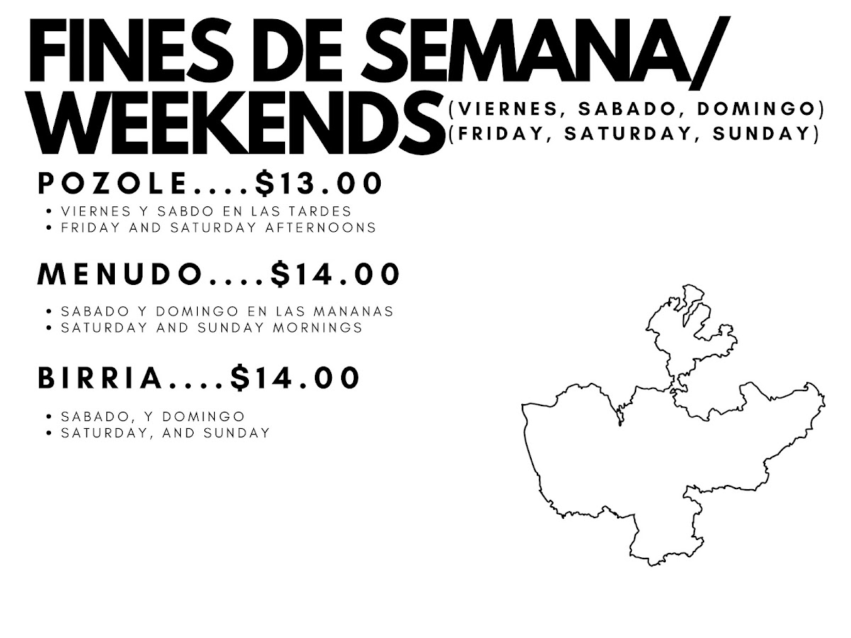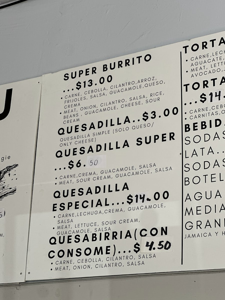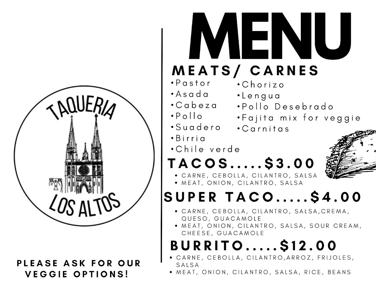 At Taqueria Los Altos on Bancroft Ave, the menu reads like a celebration of traditional Mexican flavors, offering something for every craving. Seafood lovers will find the Mariscos selection enticing, with items like Tostada Ceviche Camaron, Tostada Ceviche Pescado, Tostada Mixta, Coctel De Camaron, and Quesadilla Sp. pescado showcasing fresh, vibrant flavors. For heartier fare, the Burritos lineup, including Sup Wet Burrito Green, Sup. B. Breakfast, Sup. burrito Camaron, Super Burrito, and Sup. Wet Red. camaron, offers generous portions brimming with classic fillings. Taco enthusiasts can indulge in Shrimp Tacos, Taco Grande, Taco Lengua, Taco Pescado, and assorted Tacos that highlight both variety and authenticity. Weekend specials like Menudo, Birria, Birria Plato, and Birria De Borrego Tatemada provide comforting, slow-cooked options that make mornings extra special. The Platos section features satisfying dishes such as Plato Breakfast, Plato De Carne, Fajitas De Res, Chilaquiles, and Fajitas Mixtas, while breakfast fans will enjoy items like Burrito Jamon Y Huevo, Burrito Chorizo C/ Huevo, Breakfast B. Carne, Sup. B. Breakfast, and Plato Breakfast. Complementary Sides-including Frijoles, Guacamole, Sour Cream, Cheese, and Plato De Guacamole-add depth to every meal, and a simple Flan rounds out the menu for dessert. For drinks, guests can choose from Sodas De Lata, Sodas De Botella, Agua Fresca Chica, Agua Fresca Mediana, and Soda Bot. chicas, making it easy to pair beverages with any selection. Additionally, items like Quesadilla, Quesadilla Super, Quesadilla Especial, Quesabirria (Con Consome), and Torta showcase the restaurant’s versatility, while Regular Nachos, Taco Salad, Charolas Gde. Arroz Y Frijol, Enchiladas A La Carta, and Super Nachos offer more casual, sharable options. Overall, Taqueria Los Altos delivers a diverse menu that balances traditional favorites, seafood specialties, weekend classics, and hearty burritos, making it a go-to spot for both locals and visitors seeking authentic Mexican cuisine.